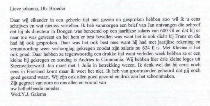 Oom Klaas Galema, die Johanna opnam, werd later toeziend voogd en Dirk Kramer voogd. In een van de brieven die Betsie in haar laatste levensjaar schreef spoorde ze Johanna aan oom Klaas vooral te bedanken voor de nieuwe jurk die ze gekegen had van hem. Oom Klaas was zelf al in 1887 weduwnaar geworden van Teuntje Terwisscha van Scheltinga en voogd over zes kinderen. Een dergelijke behulpzaamheid zagen we ook al bij de zorg voor de wezen van Assuerus Brandsma (broer van Siebrigje) en Jourica van der Werf. Toen nam tante Haukje Rijpma – van der Werf twee kinderen op, terwijl zij zelf weduwe was met vijf kinderen. Het gaat volgens mij te ver om te zeggen dat de mensen toen beter waren dan tegenwoordig. Zij deden wél waarvoor ze stonden en klaagden niet.