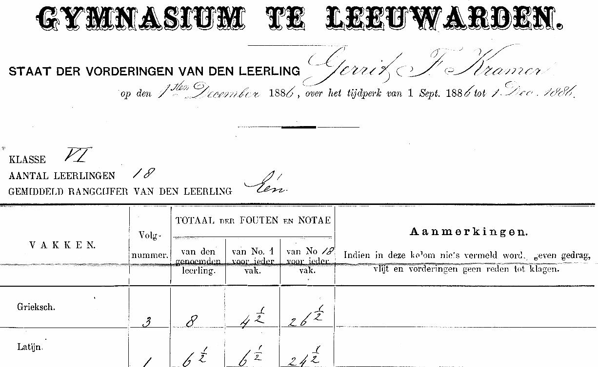 Gerrit ging naar het Gymnasium in Leeuwarden. Hij was een uitstekend student en regelmatig nr 1. Uit het rapport, dat hier gedeeltelijk wordt afgedrukt, blijkt dat hij in het laatste jaar onder 18 studenten nr 1 was. In vergelijking met nr 18 wordt exact het aantal fouten aangegeven, dat hij maakte.