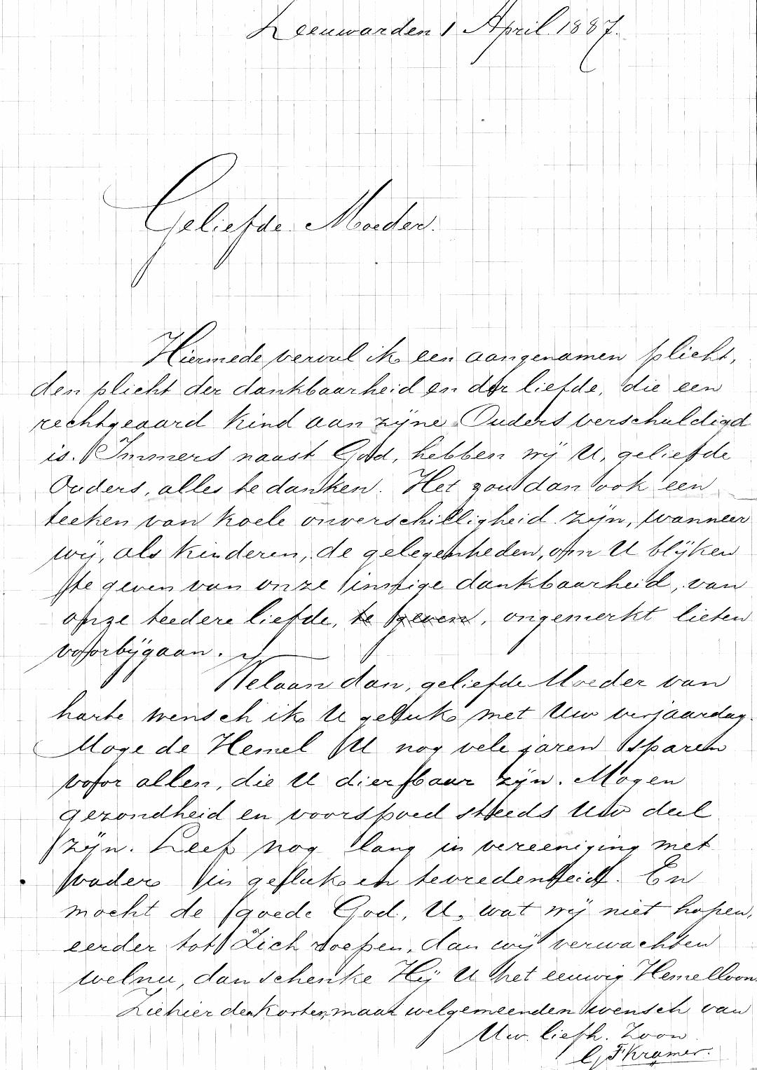 Gerrit was in Leeuwarden in de kost. Hij schreef van daaruit enkele brieven, die bewaard zijn gebleven. Op 6 october 1885 schreef hij aan zijn zwager en zus, Ysbrand en Betsie op Half Hichtum naar aanleiding van het overlijden van hun pasgeboren dochtertje Johanna. Alleen al uit de aanhef van deze brief spreekt de instelling van de toekomstige meelevende arts. Een tweede brief naar aanleiding van de verjaardag van zijn moeder in 1887 klinkt zeker niet minder oprecht maar naar onze maatstaven wel heel wat stijver. Ik citeer uit de aanhef van beide brieven.