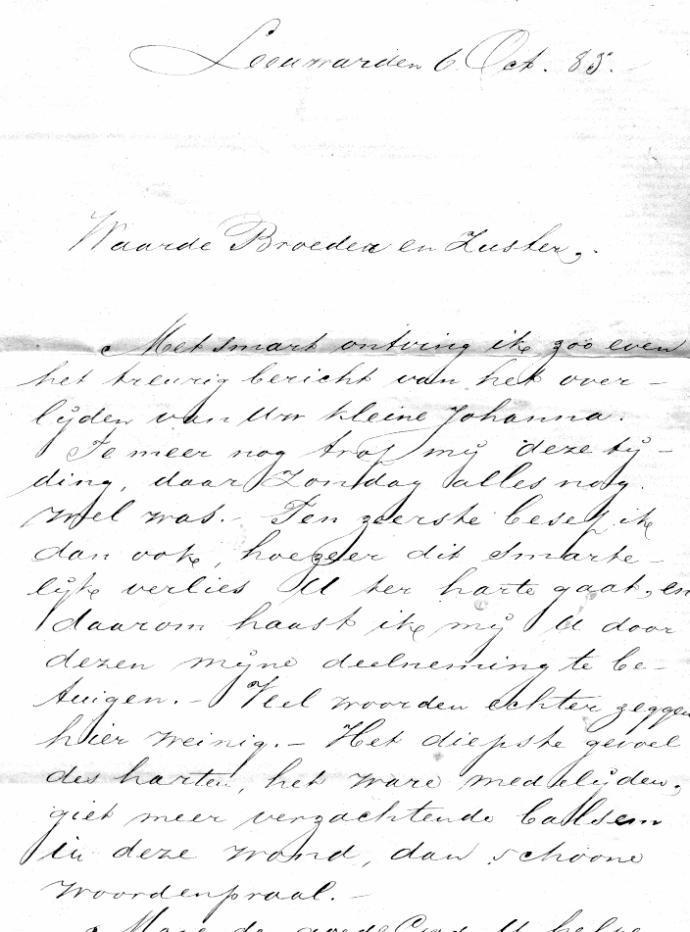 ” Waarde Broeder en Zuster, met smart ontving ik zo even het treurig bericht van het overlijken van Uw kleine Johanna. Te meer trof mij deze tijding, daar Zondag nog alles wel was…. ”